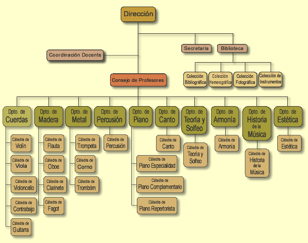 En la presente gráfica se representa la Organización Académica y Administrativa de la Escuela de Música Miguel Ángel Espinel y sus respectivas dependencias.