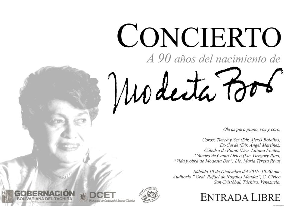 El próximo sábado 10 de Diciembre de 2016, a las 10:30 de la mañana, se estará presentando en el Auditórium “RAFAEL DE NOGALES MENDEZ” del Centro Cívico de la ciudad de San Cristóbal, el gran Concierto en homenaje a la importante Compositora Venezolana “MODESTA BOR” a los 90 años de su nacimiento. En este sentido la Escuela de Música “MIGUEL ANGEL ESPINEL” se complace en invitar al público en general para que asistan a este excelente Concierto, organizado por la Doctora Liliana Fleites, titular de la Cátedra de Piano Especialidad de esta Institución, en coordinación con la Dirección de Cultura del Estado.
