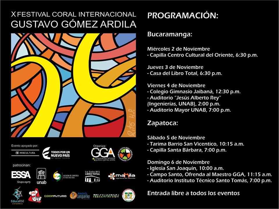 La semana de 2 al 6 de noviembre del presente año se llevó a cabo el “X FESTIVAL CORAL INTERNACIONAL “GUSTAVO GÓMEZ ARDILA”, el cual se desarrollo en la ciudad de Bucaramanga, en la hermana República de Colombia, con el apoyo del Ministerio de Cultura en el contexto del Programa Nacional de Concertación. En este sentido y con gran orgullo informamos a toda nuestra comunidad y amigos que el Coro de Cámara “EXCORDE” dirigido por el Profesor Ángel Martínez, ha obtenido el 1ER LUGAR, en representación de nuestro país, en el mencionado concurso además de haber sido galardonado con el premio ”AL MEJOR DIRECTOR” . Es importante resaltar que el Coro de Cámara “EXCORDE”, está conformado por jóvenes cuya pasión es la música y que con su trabajo constante y esfuerzo lograron la preparación optima la cual se tradujo en los resultados obtenidos.